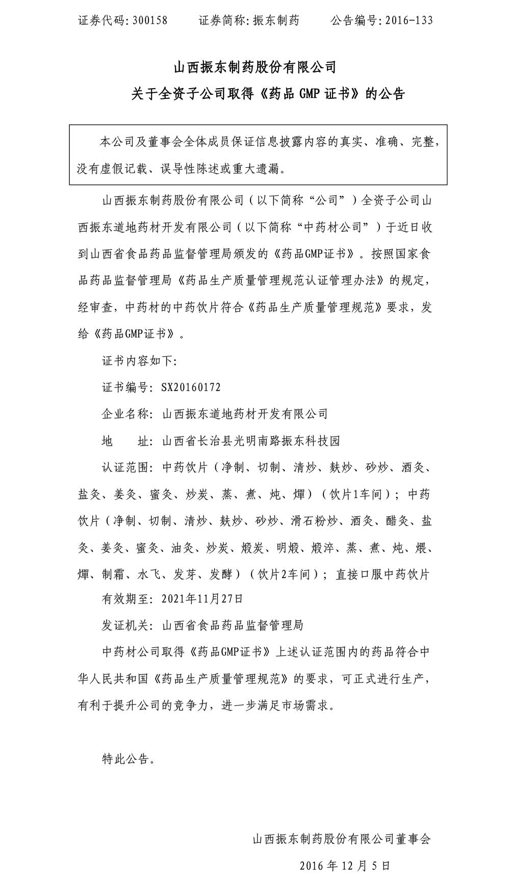 cq9电子官网入口制药:关于全资子公司取得《药品GMP证书》的通告